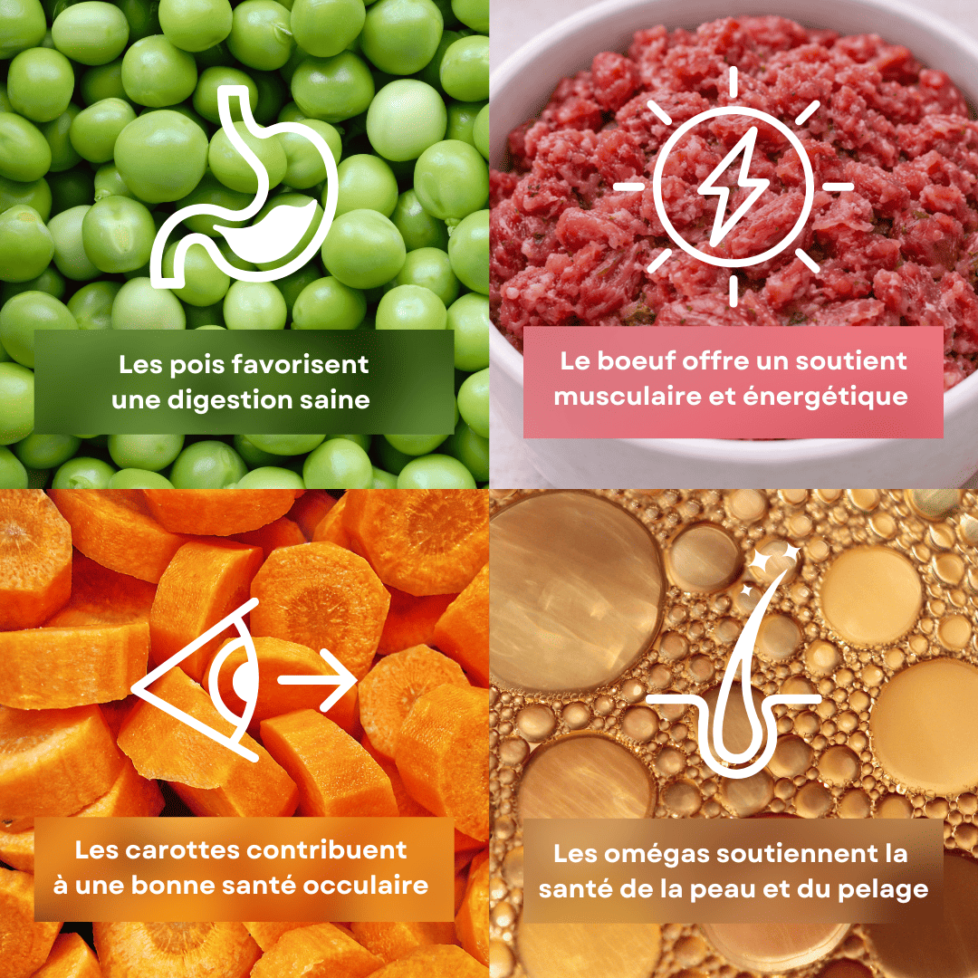 L’ingrédient principal de cette recette est le bœuf bio français, pour un apport optimal en protéines animales françaises. Pour compléter cette base, nous ajoutons des légumes bio, à commencer par les carottes. Riches en vitamine A, elles renforcent le système immunitaire et favorisent la santé de la peau et du pelage. Cette vitamine joue également un rôle essentiel dans la croissance cellulaire et la synthèse de certaines protéines.