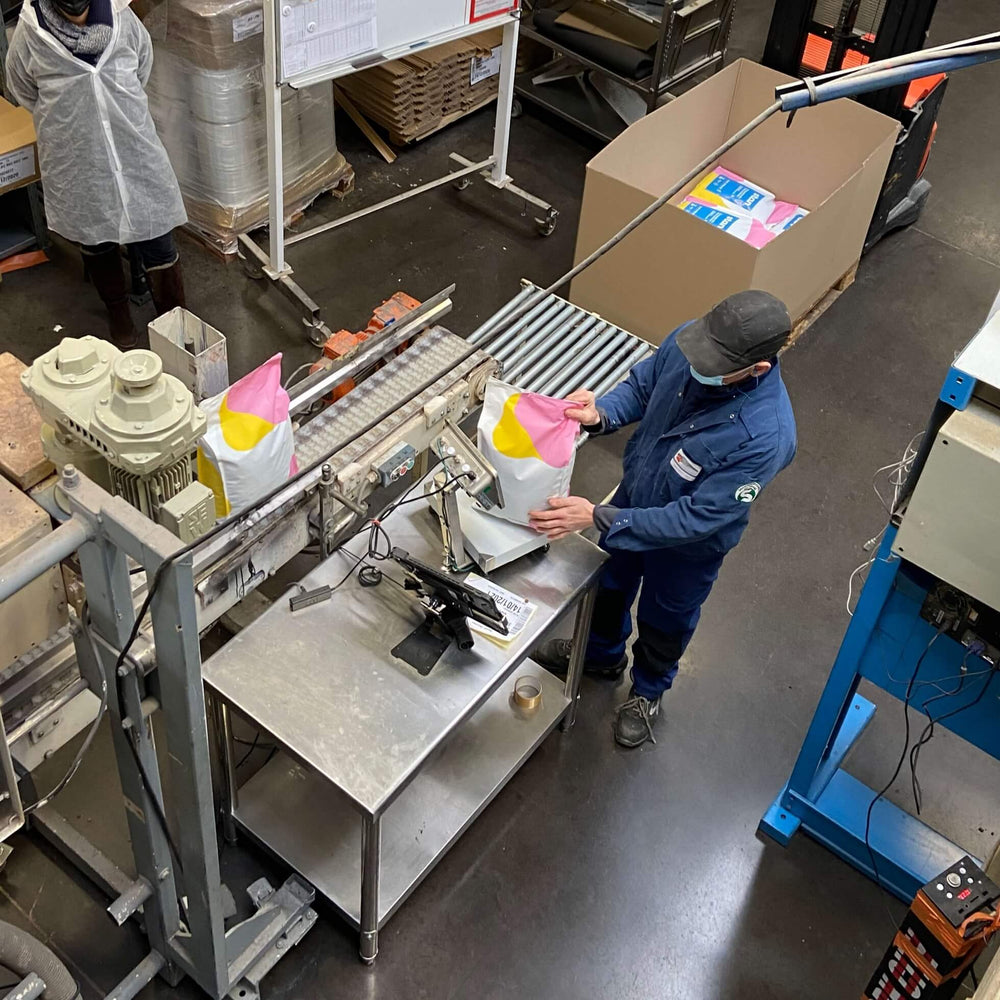 Un dernier passage sur un tapis pour être refroidies, encore des contrôles pour les examiner sous toutes les coutures et les voilà enfin prêtes pour leur dernier voyage. Nos amours de croquettes vont finir leur aventure avec l’étape de la mise en sac, où là encore nos professionnels vont les ausculter une dernière fois. Confortablement installées dans leur sac, elles attendent avec impatience dans notre atelier, le jour où vous allez les choisir.
