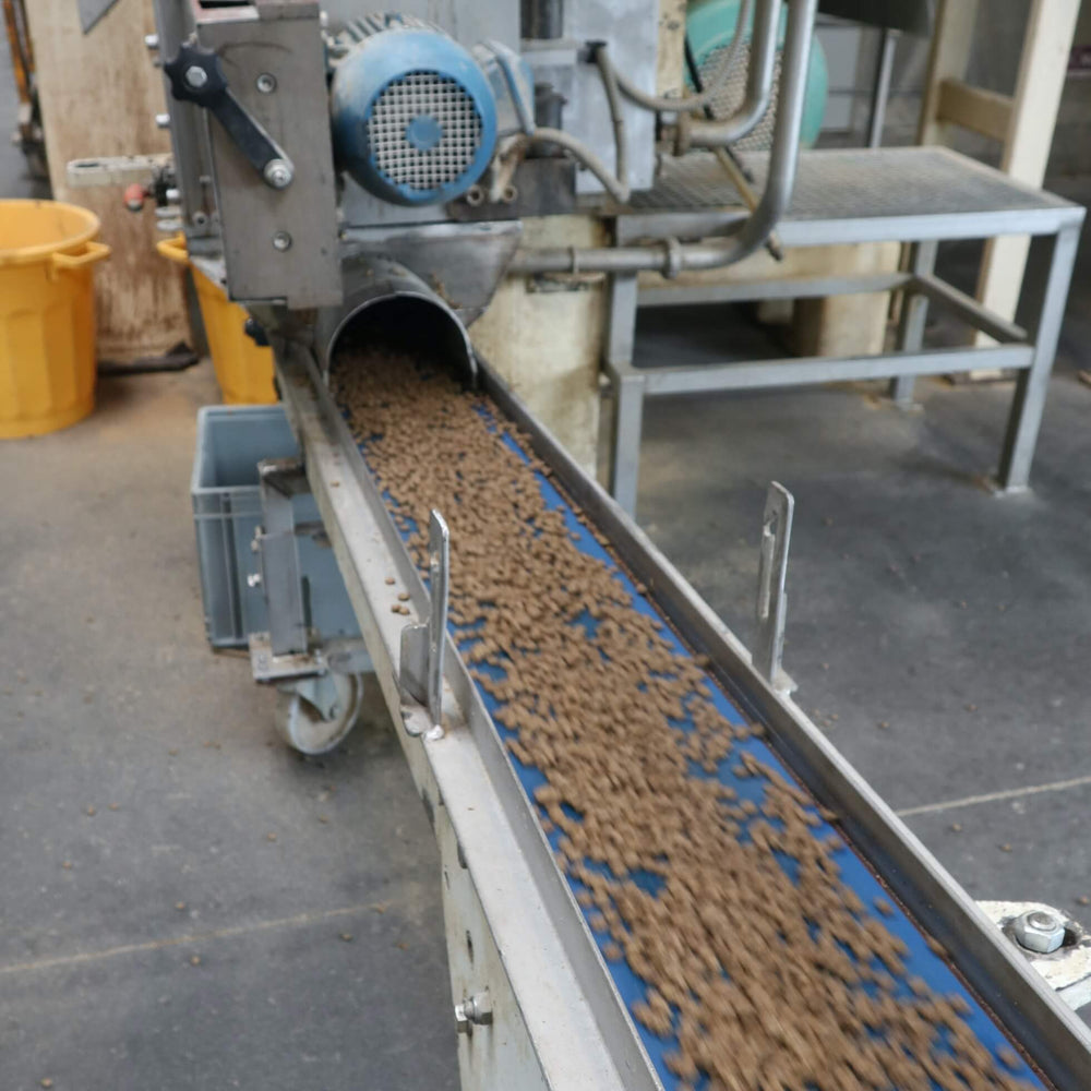 C’est ici que commence l’aventure pour nos amours de croquettes : passage dans une grande mélangeuse, puis dans le conditionneur où ils font connaissance avec les ingrédients frais avant le passage magique de l’extrudeur ! Passage où d’état « ingrédients » ils se transforment en une belle croquette. Là, nos professionnels vérifient avec attention sa taille, sa couleur, sa forme, sa cuisson … et bien d’autres paramètres ! Un véritable examen avant de poursuivre l’aventure.